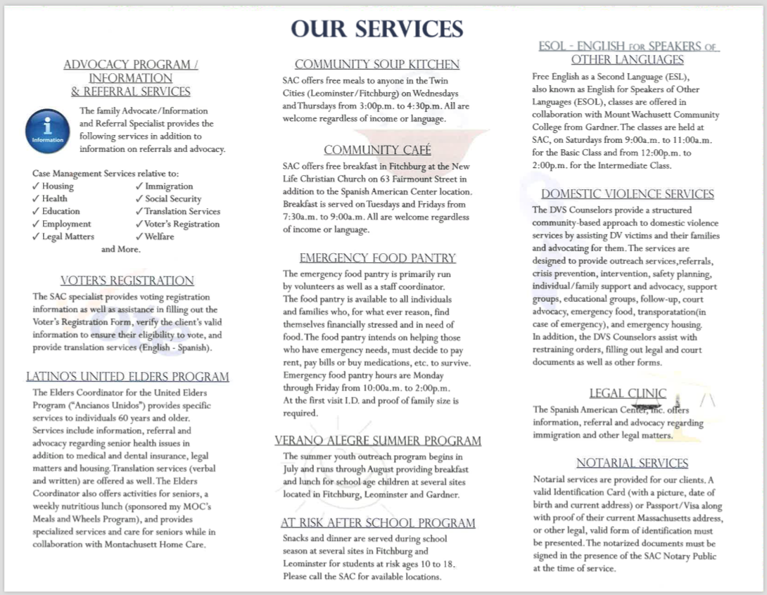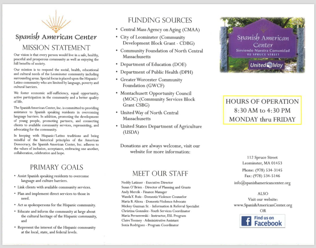 © Spanish American Center, Inc. | 112 Spruce Street, Leominster, MA 01453 | Fax: 978-534-5146 | Phone: 978-534-3145