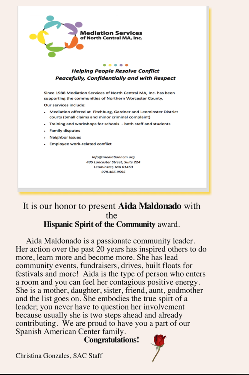 Hispanic Community Spirit Award Recipient 2017:  Ms. Aida Maldonado.